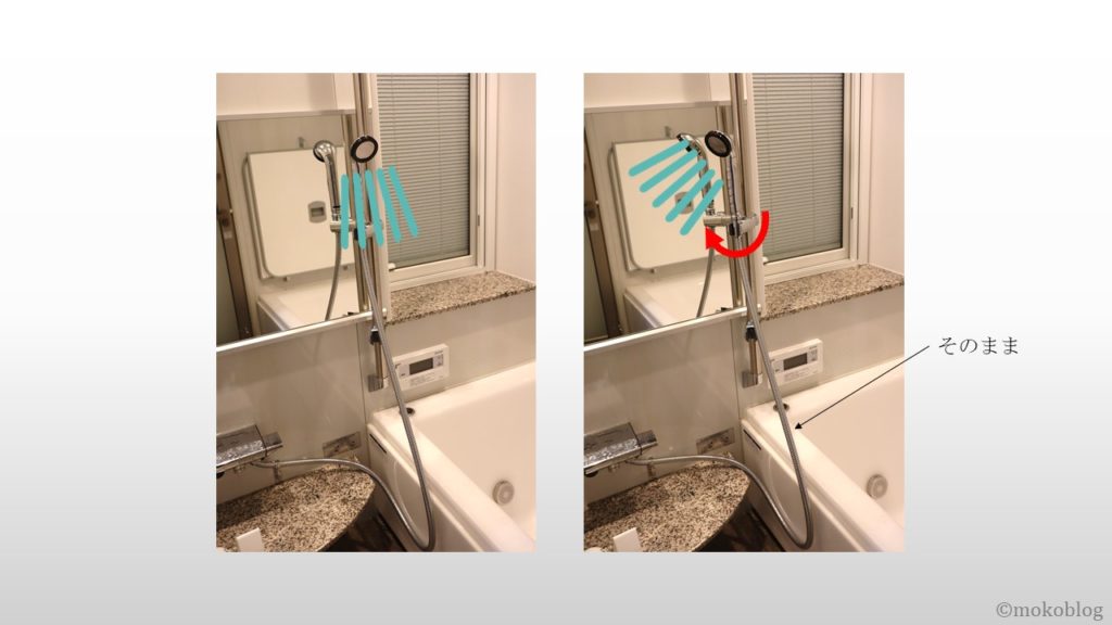 ヘッドを回転させるだけでシャワーの向きを変えることができるので、ホースの位置はそのままです。