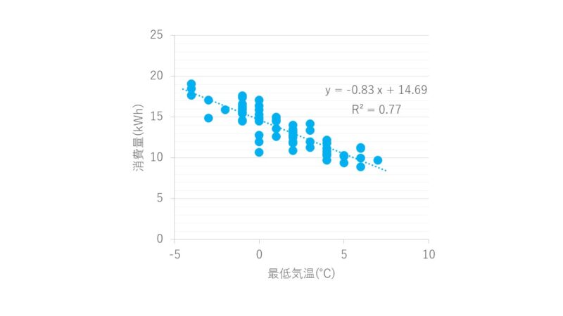 グラフから、最低気温が低いほどナイトタイムで消費する電気量が多くなる傾向がわかります。