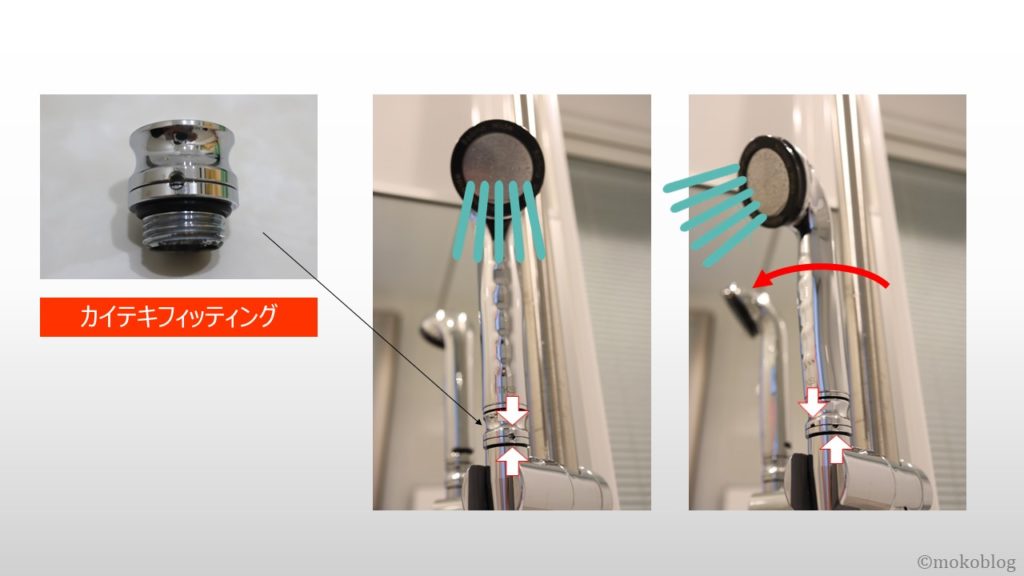向けたい方向にシャワーヘッドを向けると『カイテキフィッテング』の上部も向くので、ヘッドを持ち上げずに回転させるだけでOKです。