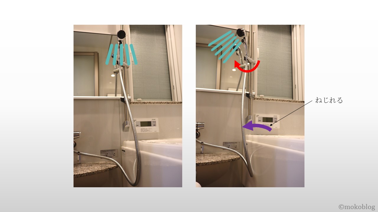 ホースを固定する位置にもよりますが、座ってシャワーを使用する場合、どうしてもホースが余ってしまいます。