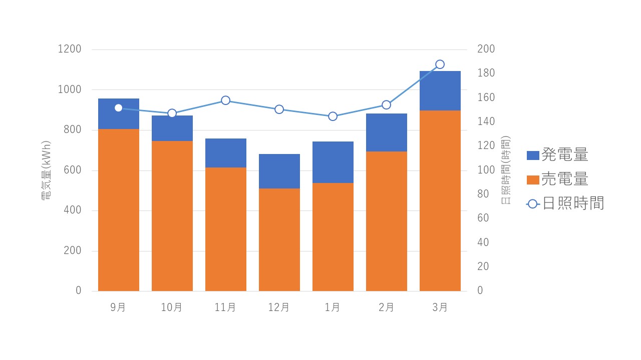 太陽光パネルによる発電量と売電量に加えて、日照時間を入れました。