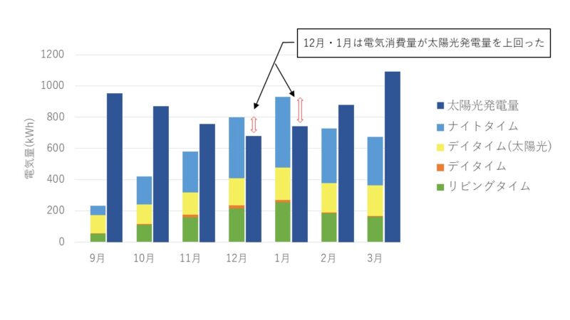 2つを比較すると、12月・1月以外の月は太陽光発電量が消費量を上回っていました。
