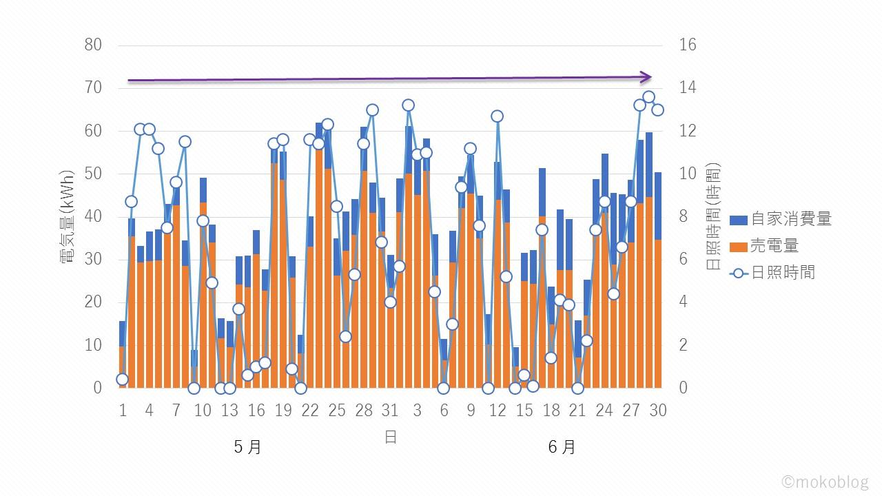 2か月分の太陽光パネルによって発電された電気の自家消費量と売電量に加えて、日照時間を入れました。