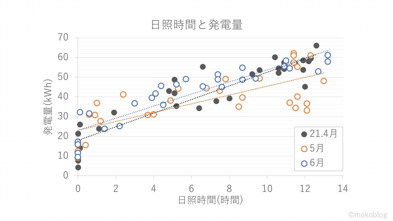 しかし、若干、グラフの傾きが緩くなっているようにも見え、同じ時間照らされても発電量は落ちている落ちてきているのかな?!と思いました。