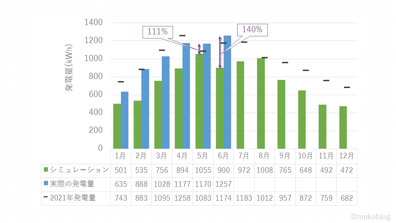 最も発電した2021年4月のデータと比較しても、5月・6月の発電量はほぼ同じように発電されていて、経年劣化しているようには見えません。