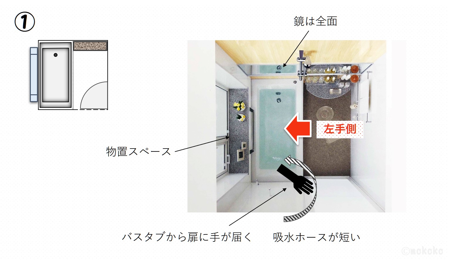 私のようなお風呂の入り方をすると、洗面椅子に座りバスタブ内のお湯を風呂桶で汲むとき、右手の方がやりやすいです。