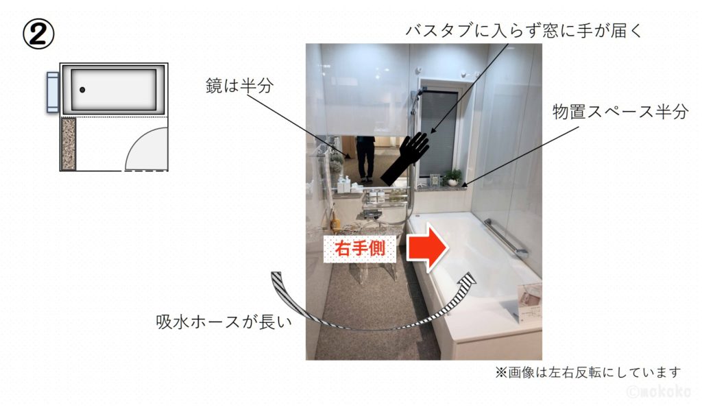 そうなると、風呂桶の出番がなくなり、バスタブの位置が②ヨコ向きでなくてもよくなってしまいます。