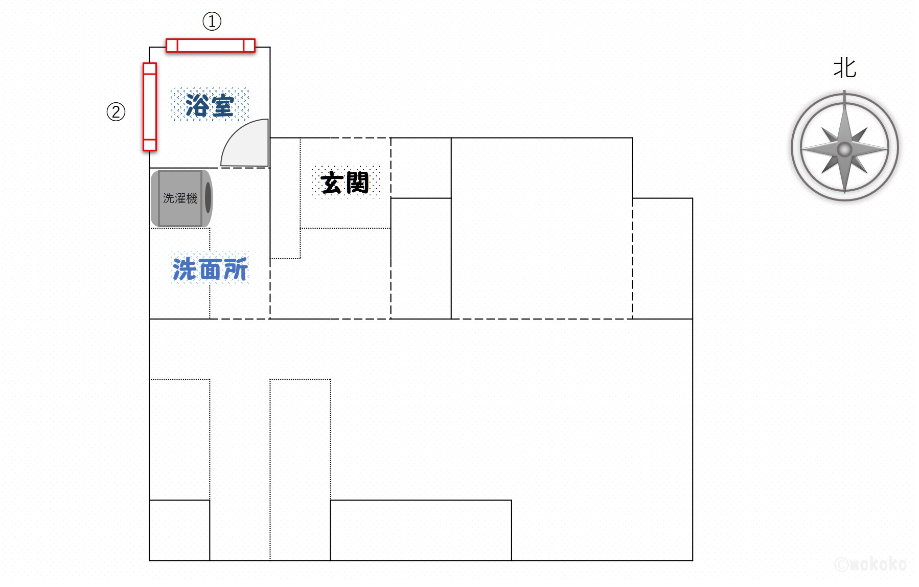 北玄関の間取りの我が家は、浴室・洗面所の位置が、北、西側に集まっています。