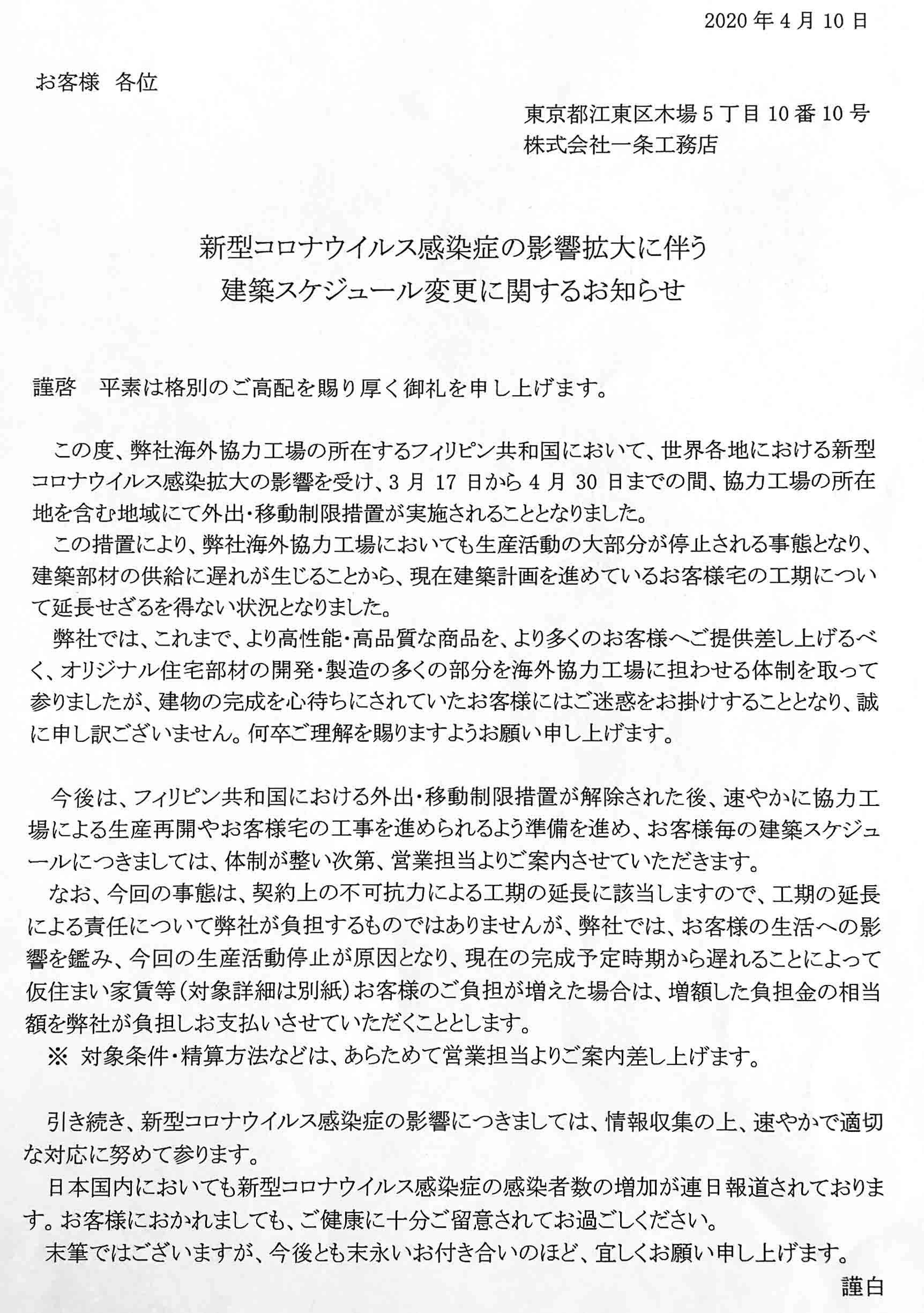書類上、4月30日までとなっている制限措置は、一条工務店のフィリピン工場のある地域においても延期されてもおかしくありません。