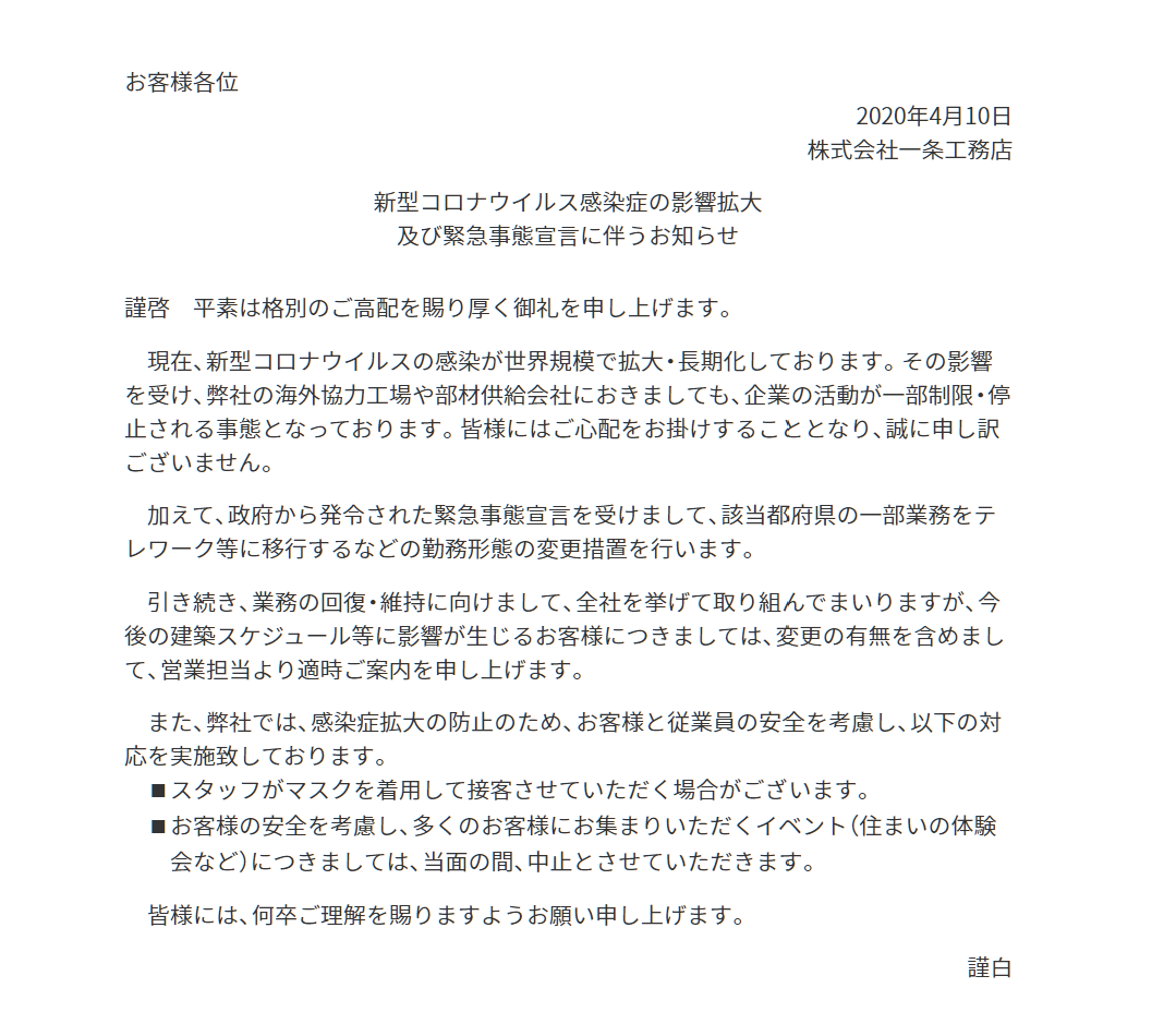 また、現在(5/1)、一条工務店のHPに記載がある通り、一条ラボや暮らしの体験会などのイベントが中止されているため、家造りを考えている方にとっても影響が出ています。